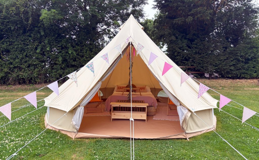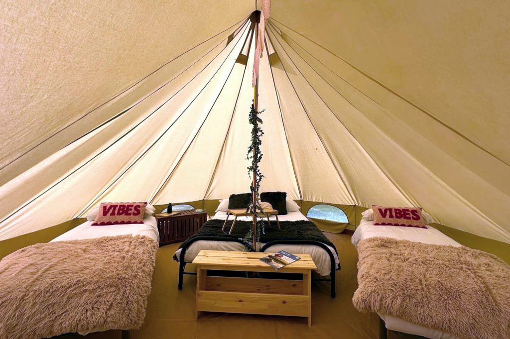 Instead, Ashbourne Heights’ four-person bell tents include quality bedding and bed linen, cosy throws and cushions, matting rugs on the floor, and tasteful interior decoration.